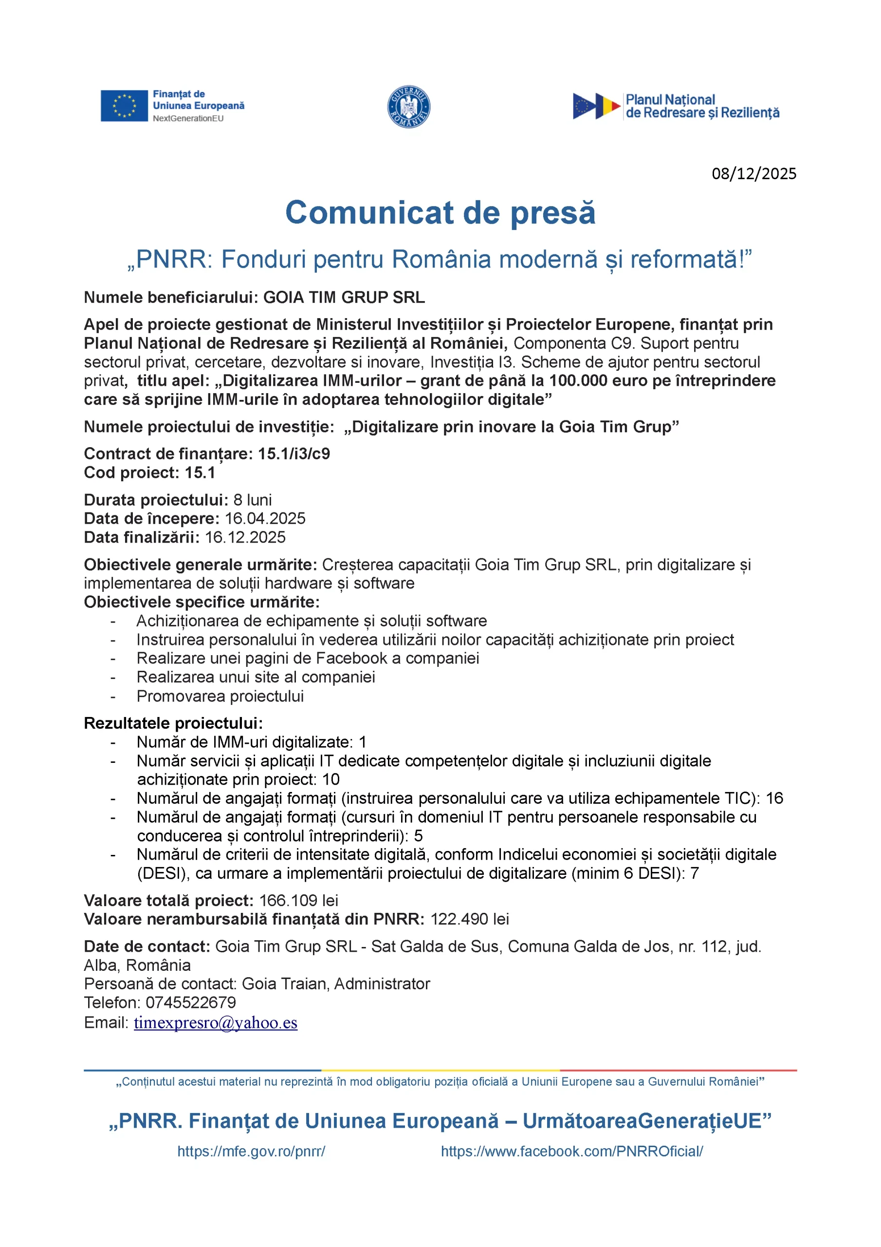 Apel de proiecte gestionat de Ministerul Investițiilor și Proiectelor Europene, finanțat prin Planul Național de Redresare și Reziliență al României, Componenta C9. Suport pentru sectorul privat, cercetare, dezvoltare si inovare, Investiția I3. Scheme de ajutor pentru sectorul privat, titlu apel: „Digitalizarea IMM-urilor – grant de până la 100.000 euro pe întreprindere care să sprijine IMM-urile în adoptarea tehnologiilor digitale”