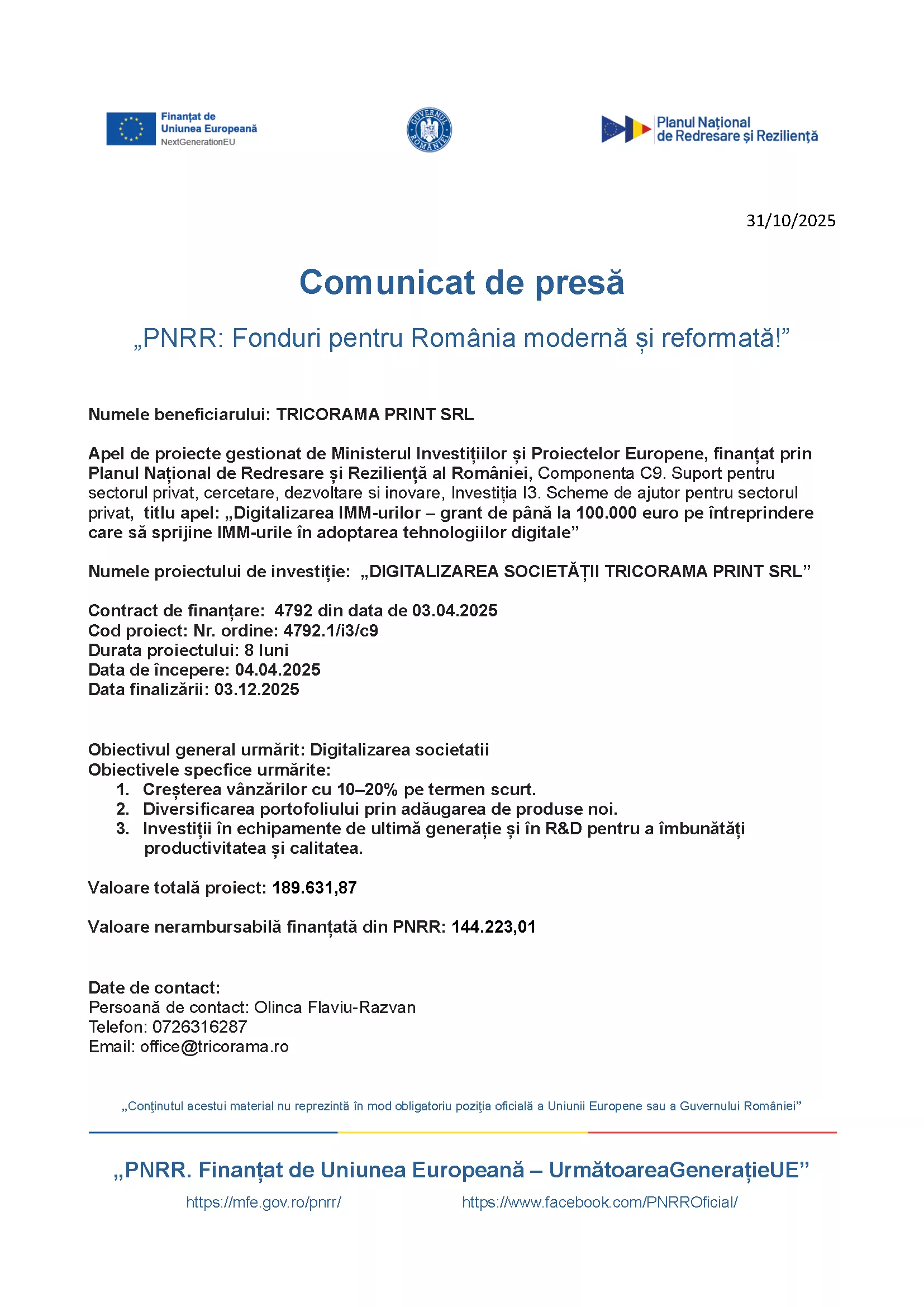Numele beneficiarului: TRICORAMA PRINT SRL