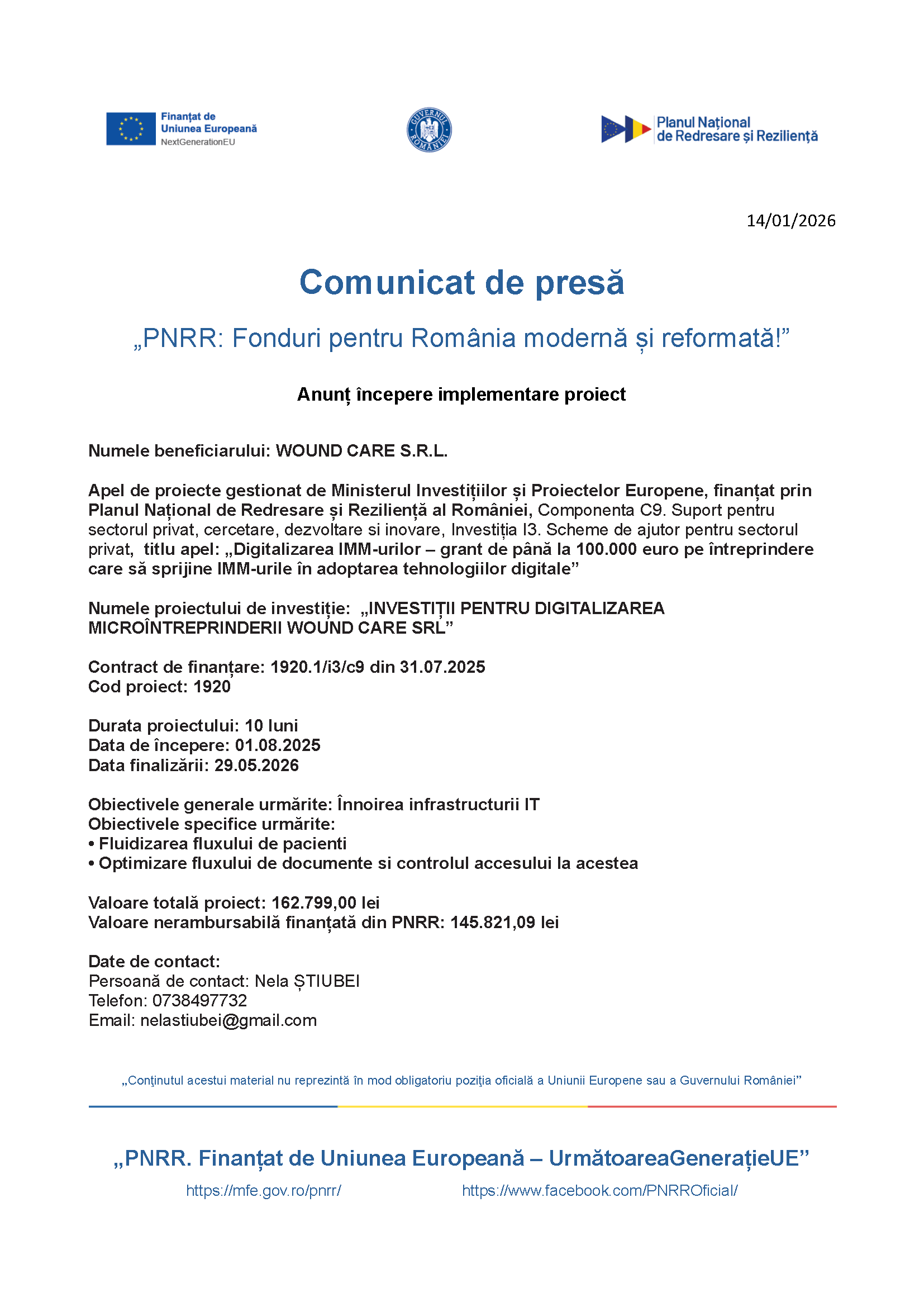 Numele proiectului de investiție: „INVESTIȚII PENTRU DIGITALIZAREA MICROÎNTREPRINDERII WOUND CARE SRL”