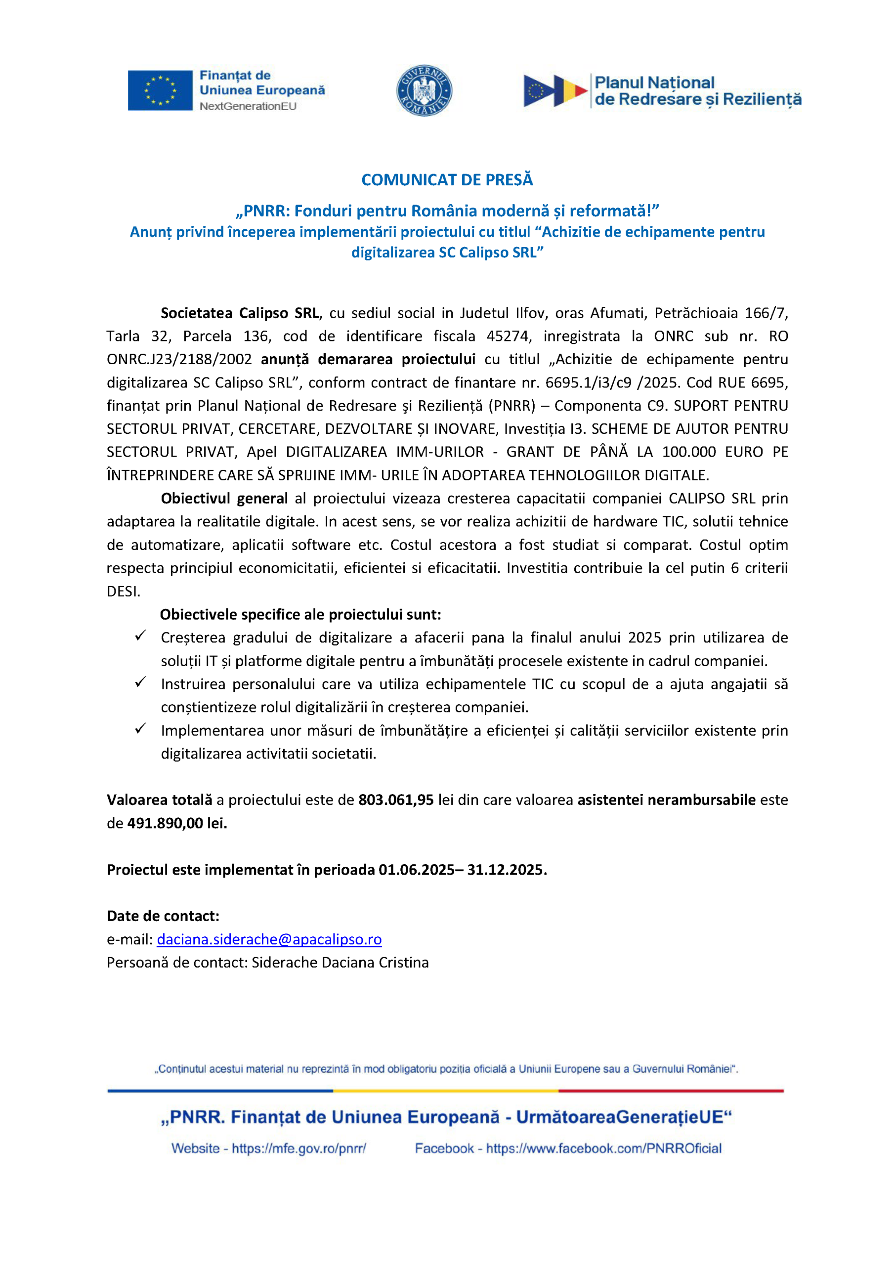 Societatea Calipso SRL, cu sediul social in Judetul Ilfov, oras Afumati, Petrăchioaia 166/7, Tarla 32, Parcela 136, cod de identificare fiscala 45274, inregistrata la ONRC sub nr. RO ONRC.J23/2188/2002 anunță demararea proiectului cu titlul „Achizitie de echipamente pentru digitalizarea SC Calipso SRL”, conform contract de finantare nr. 6695.1/i3/c9 /2025. Cod RUE 6695, finanțat prin Planul Național de Redresare şi Reziliență (PNRR) – Componenta C9. SUPORT PENTRU SECTORUL PRIVAT, CERCETARE, DEZVOLTARE ȘI INOVARE, Investiția I3. SCHEME DE AJUTOR PENTRU SECTORUL PRIVAT, Apel DIGITALIZAREA IMM-URILOR – GRANT DE PÂNĂ LA 100.000 EURO PE ÎNTREPRINDERE CARE SĂ SPRIJINE IMM- URILE ÎN ADOPTAREA TEHNOLOGIILOR DIGITALE.