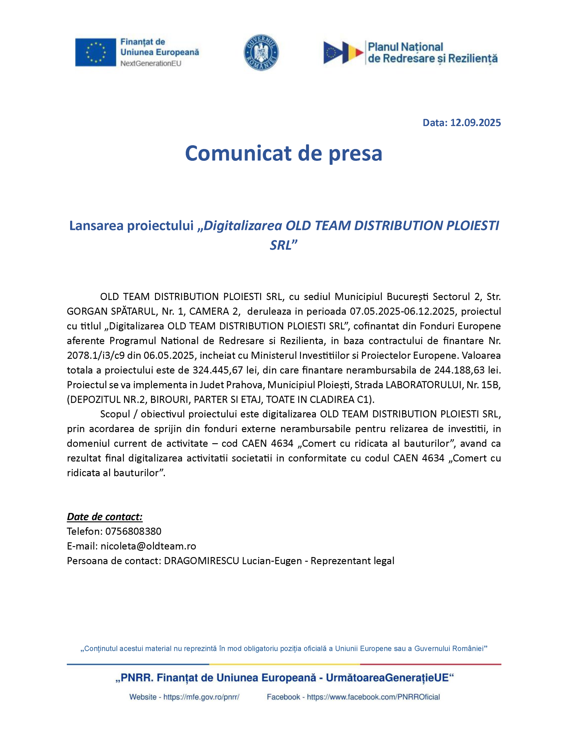 OLD TEAM DISTRIBUTION PLOIESTI SRL, cu sediul Municipiul Bucureşti Sectorul 2, Str. GORGAN SPĂTARUL, Nr. 1, CAMERA 2, deruleaza in perioada 07.05.2025-06.12.2025, proiectul cu titlul „Digitalizarea OLD TEAM DISTRIBUTION PLOIESTI SRL”, cofinantat din Fonduri Europene aferente Programul National de Redresare si Rezilienta, in baza contractului de finantare Nr. 2078.1/i3/c9 din 06.05.2025, incheiat cu Ministerul Investitiilor si Proiectelor Europene. Valoarea totala a proiectului este de 324.445,67 lei, din care finantare nerambursabila de 244.188,63 lei. Proiectul se va implementa in Judet Prahova, Municipiul Ploieşti, Strada LABORATORULUI, Nr. 15B, (DEPOZITUL NR.2, BIROURI, PARTER SI ETAJ, TOATE IN CLADIREA C1).